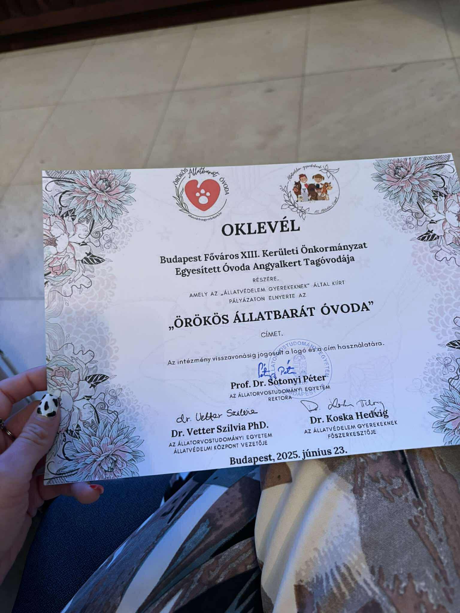 Intézményünk elnyerte az ,,Örökös Állatbarát Óvoda” címet.