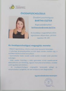 Időpont-egyeztetés személyesen, az óvodapedagógusok segítségével vagy e-mailen keresztül: barthaeszter@ovoda.bp13.hu