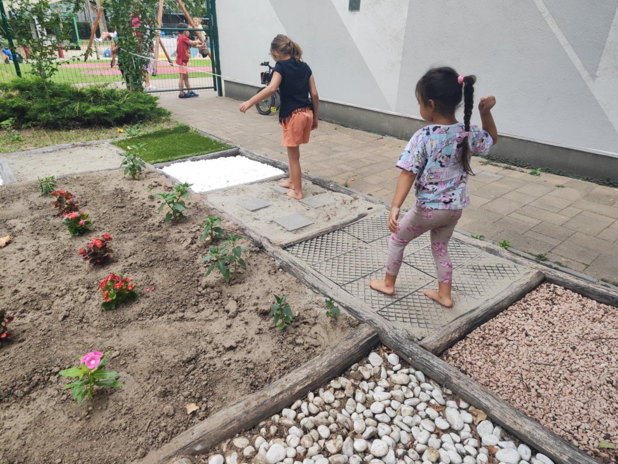 Óvodánk kiemelten figyel gyermekeink egészségére, minél több egészségmegőrző tevékenység biztosítására. A mezítlábas ösvény, Sebastian Kneipp német természetgyógyász nevéhez fűződik. Lényege, hogy olyan ösvényen sétálunk mezítláb, melyet más és más felületű anyagok borítanak, ezáltal stimuláljuk a talp különböző reflexpontjait. A tanösvényen való séta során a gyermekek mezítláb tapasztalhatják meg a, homok, kavics, fa, tengerparti kövek és egyéb természetes felületek változatos textúráját, miközben élményekkel gazdagodnak, és játékos módon fejlesztik testi és érzékszervi képességeiket.A mezítlábas ösvények használata jótékonyan hat a vérkeringésre, az immunrendszerre, az idegrendszerre. Erősíti az izmokat, megelőzi a visszerek és a lúdtalp kialakulását, javítja az anyagcserét, az emésztést, és a migrénre is jótékonyan hat.