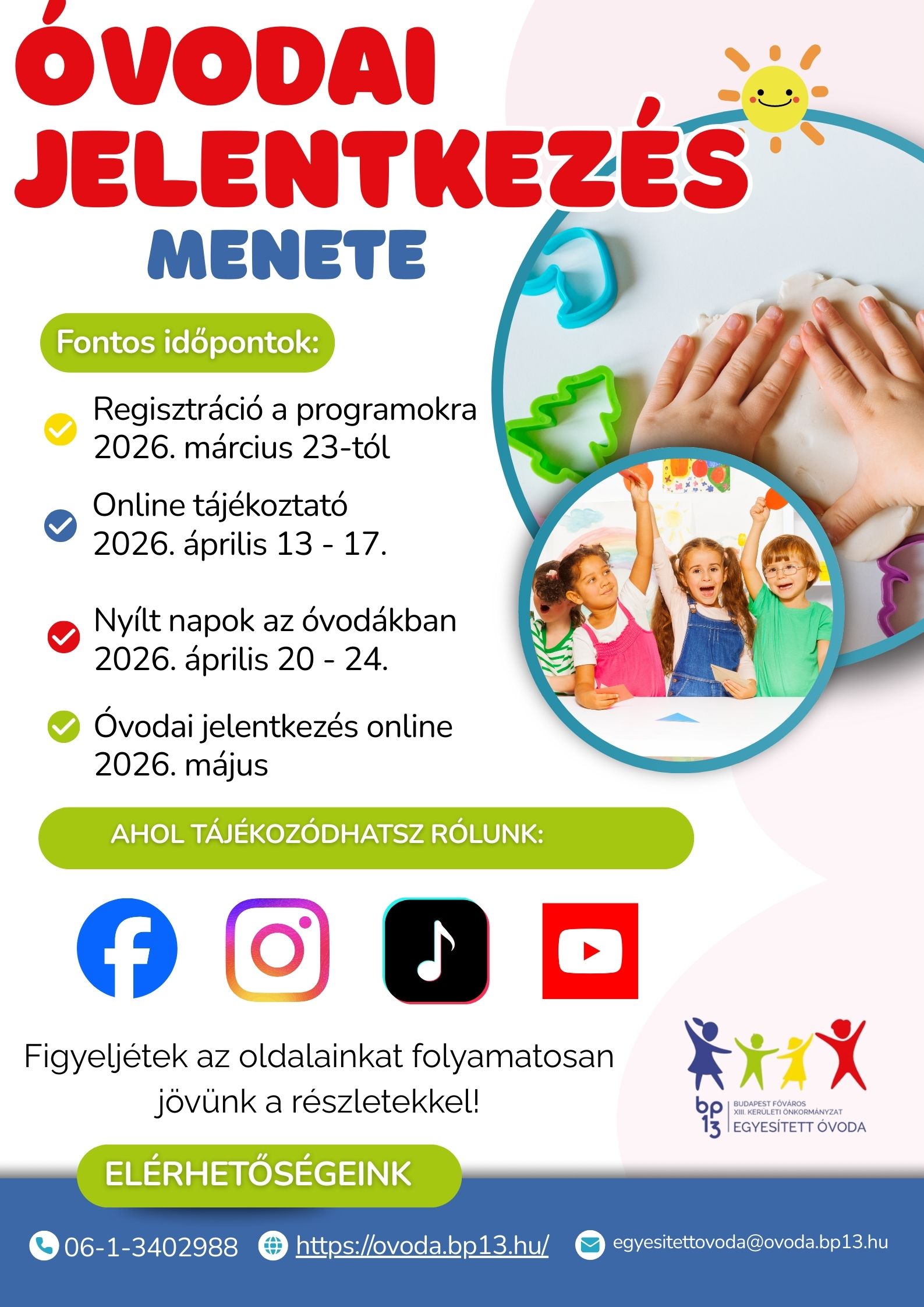 határidejéről a fenntartó rendelkezései szerint hirdetményt teszünk közzé, valamint az óvodai hirdetőtáblákon, az óvodai honlapon tájékoztatjuk a szülőket.