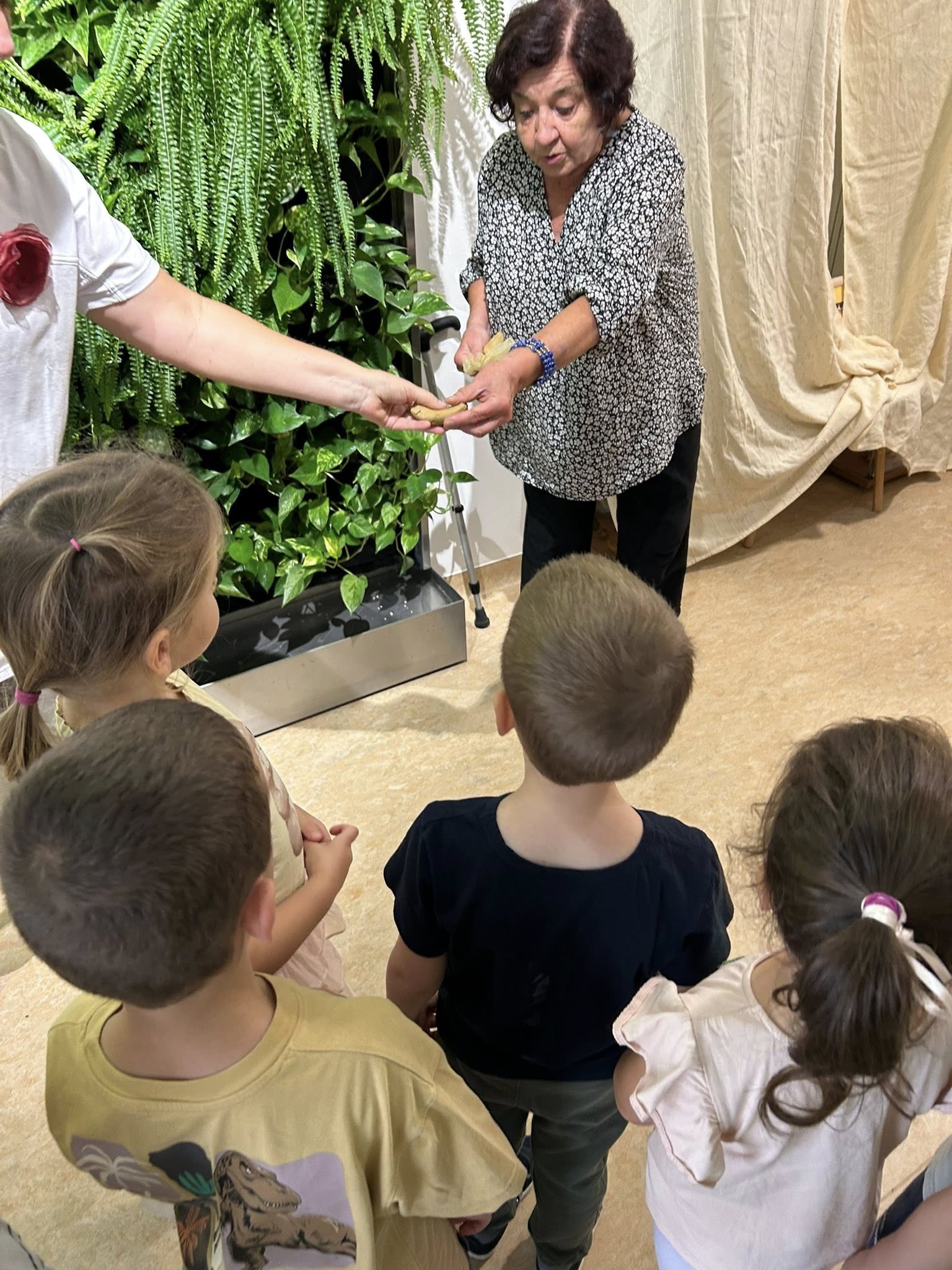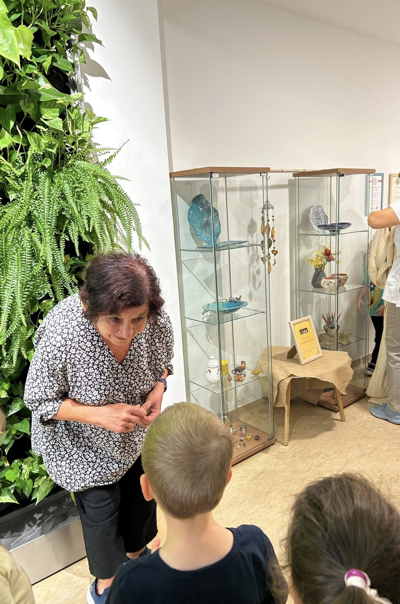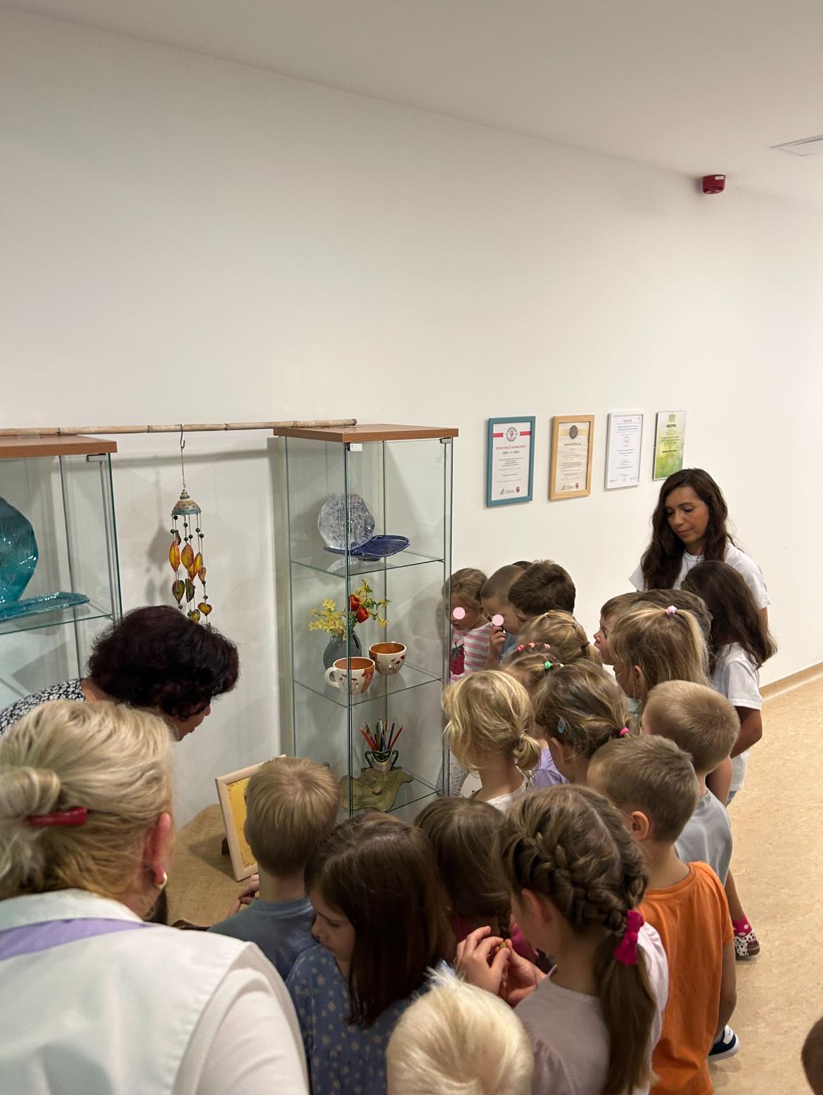 A kiállításon apró kedves díszek, nagyobb tálak, madáritató, szélcsengő, mézescsupor, ceruzatartó és még sok más „haszna és mihaszna” kincs várta a gyerekeket. Ili néni nemcsak a tárgyakat hozta el, hanem mesélt is nekünk a kerámiázás folyamatáról. Az agyagot is kézbe vehették a gyerekek, a puha, barnás színű anyag kézről kézre járt, és mindenki kipróbálhatta, milyen érzés formázni. A gyerekek csillogó szemmel hallgatták Ili nénit, majd lelkesen fedezték fel a kiállított alkotásokat.