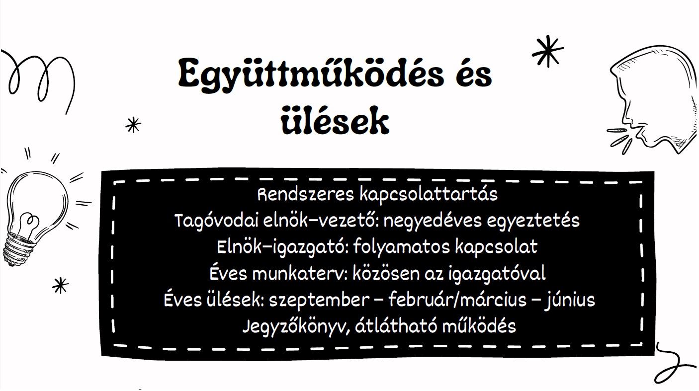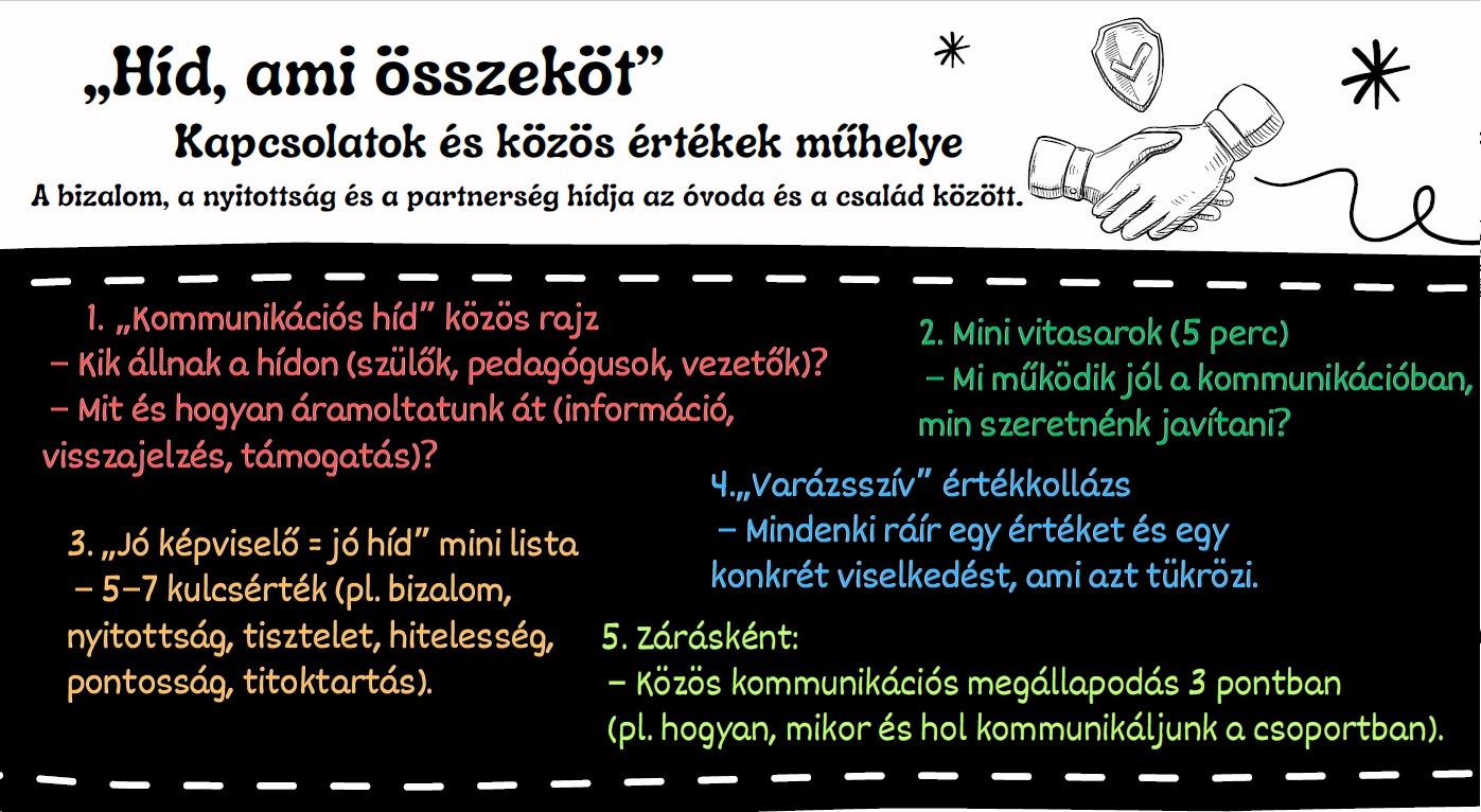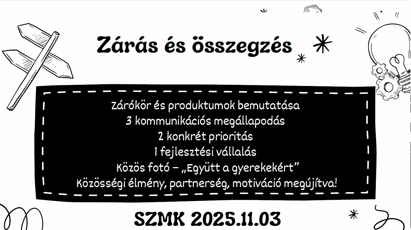 A résztvevők aktív jelenléte és együttgondolkodása jól mutatta, hogy a közös célok mentén formálódó partnerség valódi értéket teremt a gyermekek mindennapi óvodai életében. A műhely során született ötletek és megállapodások a következő időszakban beépülnek a tagóvoda közösségi munkájába.