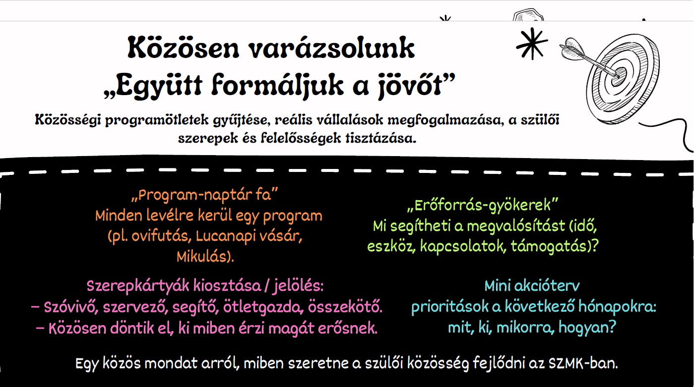 2025 őszén új formában valósítottuk meg Szülői Szervezetünk (SZMK) műhelymunkáját, amelynek célja a szülők és az óvoda közötti együttműködés, bizalom és közösségi kohézió erősítése volt. A műhely két nagy, interaktív projekt köré szerveződött, amelyek során a résztvevők közösen gondolkodtak a kommunikációról, a közös értékekről, valamint az óvodai élethez kapcsolódó programokról és szülői szerepekről.